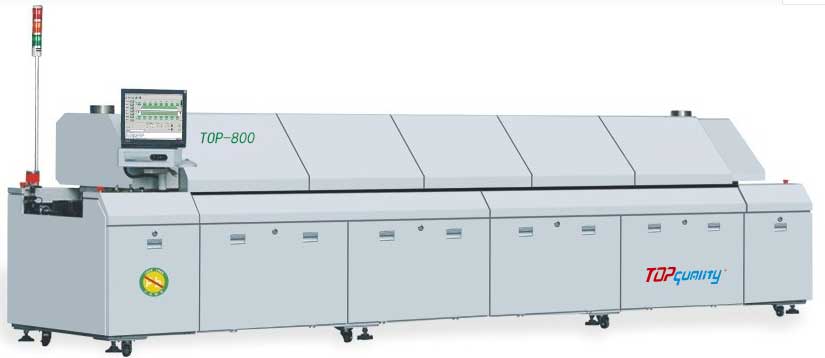 大型电脑无铅八温区回流焊,主要用于大规模PCB板锡膏焊接。运风马达有变频器控制转速,加热板为10MM后的镀铜铝板,热补偿性能好。