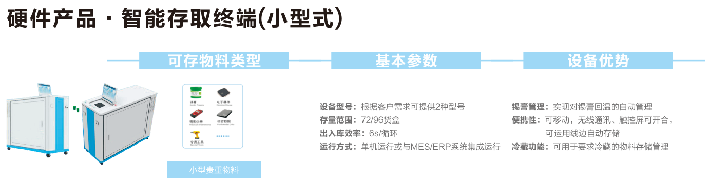 小型一对一智能存取终端,可实现对锡膏回温的自动管理,可移动,无线通讯、触控屏可开会,可运用线边自动存储。可用于要求冷藏的物料存储管理。